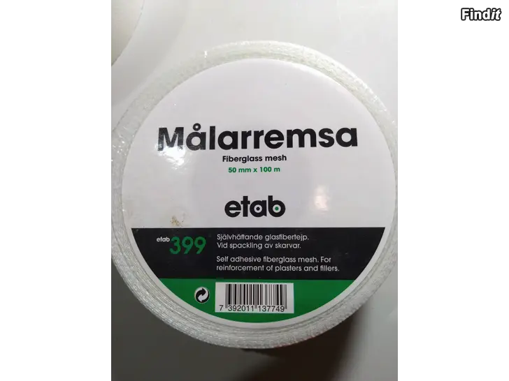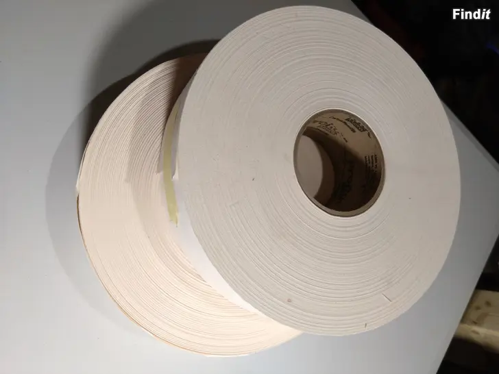 Tre oöppnade rullar självhäftande glasfiberremsa, 100 meters rulle 8 € pris på Byggmax 14,95 €, mindre 45 meters rullar 5 €/st.