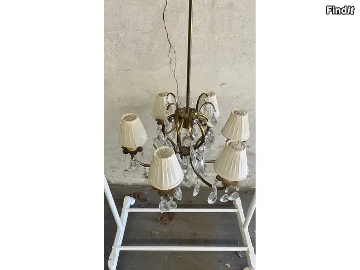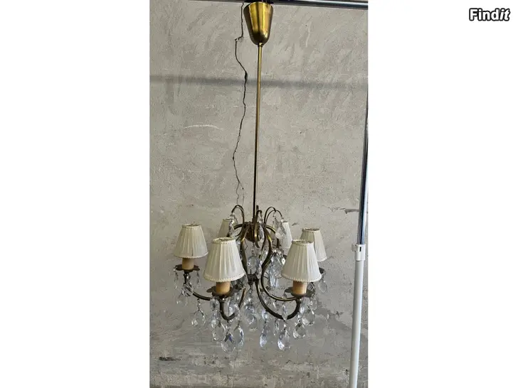 Lampan har sex ljuspunkter och tygskärmar som mjukar upp ljuset. Troligen tillverkad i mitten av 1900-talet.