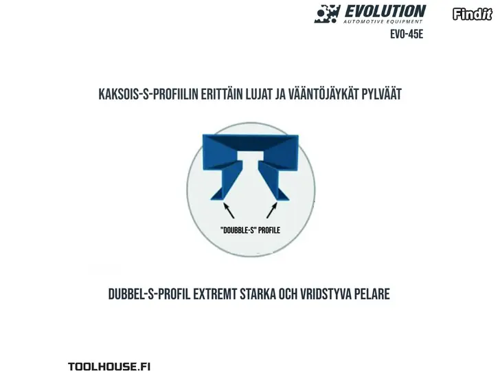 Evolution 45E är en kraftfull hydraulisk tvåpelarlyft, med lyftkapacitet på 4500 kg och långa, symmetriska 3-delade lyftarmar passar den både mindre och större fordon.