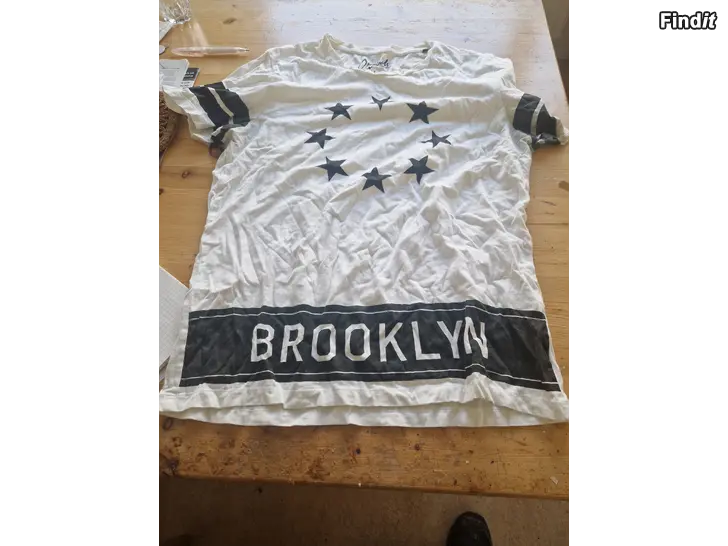 Snygg vit t-shirt från Newbie med svart BROOKLYN-tryck nedtill och svarta stjärnor på bröstet. T-shirten har korta ärmar med svarta ränder och är i mjuk bomull. Perfekt för en avslappnad streetstyle-look.