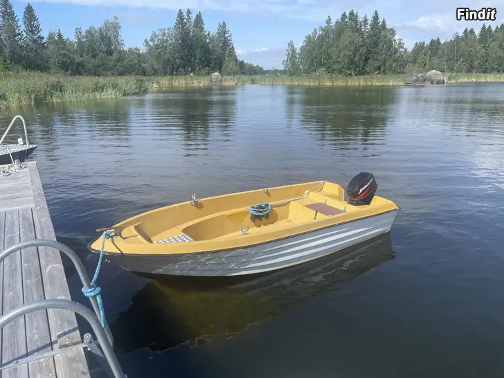Säljes lohi 415 i ok skick med mercury 20hp 2takt från 2004. Medföljer extra propell tank åror mittbänk ankare, ingen trailer.