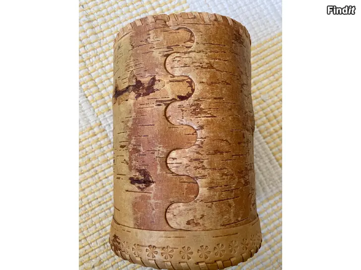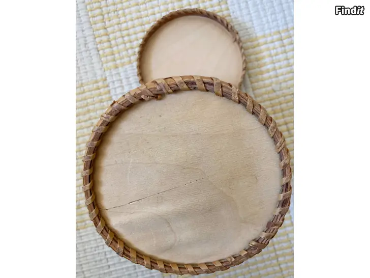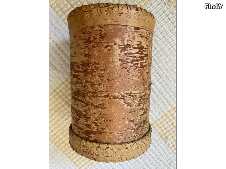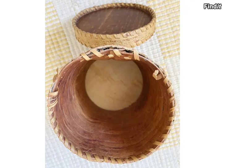 Rund vintage burk med lock handtillverkad av björknäver. Höjd 19 cm, diameter ca 13 cm